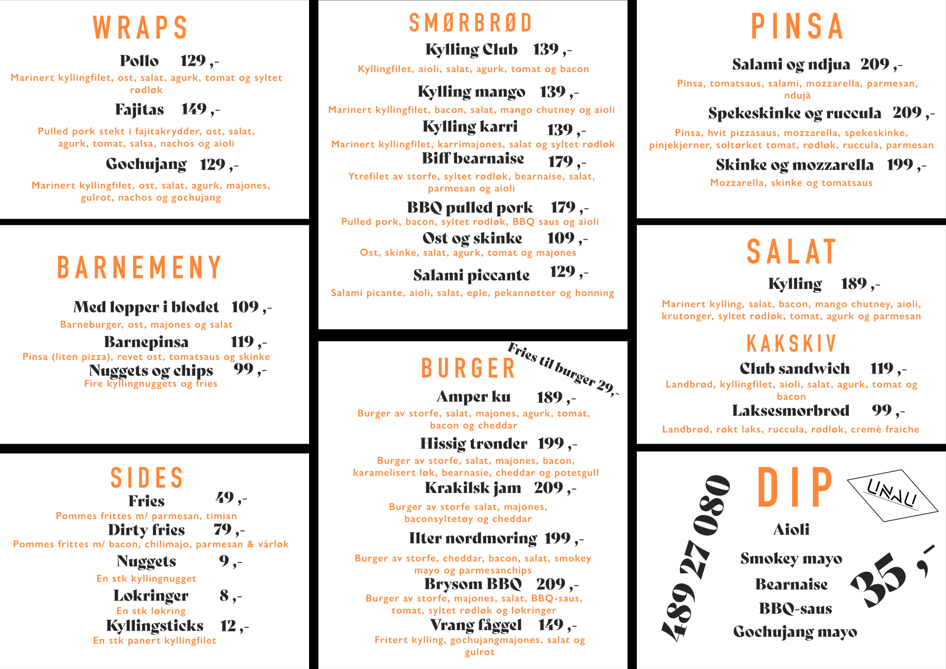 Dette er våre menyer, som inneholder alt fra ferske baguetter, smaksrike salater, lokalproduserte smashburgere, spennde wraps og kaffe fra hele verdens kriker og kroker.